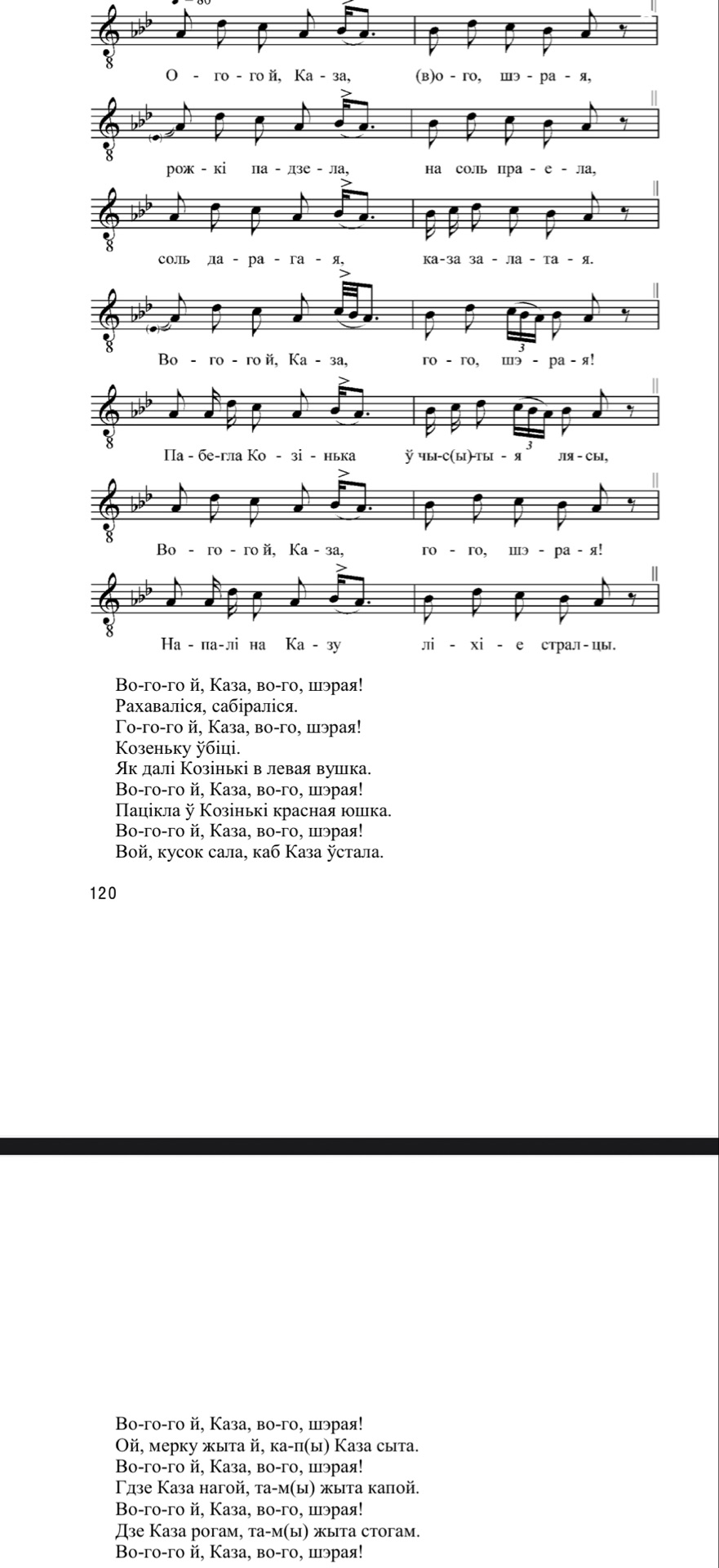 – Вот ужо ў Каляды дак Кабылка была, на Кабылцы ездзілі. Там быў паніч, каторы запрашае ў хату свістком, ходзя... так. Тады на Кабылцы ездзілі. Вот там былі Міханош, каторы просіць ужэ у хазяіна, штоб плаціў вот: «Хазяінка, сколькі у цябе дзірвянцоў, каб столькі ты меў чырвянцоў, сколькі ў цібе моху, каб столькі гароху, а хлеба кусочык (каб усяго даў ім), а дзяцей куточык у цябе будзіць! Хазяінка, дай нам што-небудзь!» Вот хадзяін ужэ ўстае, ідзе, нясе кусок сала, каўбасу, ў каго што ё, а хто вядро жыта, хто вядро пшаніцы, ўсе давалі, так. Вот еты Паніч ужо выйдзя прыбраны, із лентамы тут, із нагайка, свісток у руках, выйдзя на вуліцу – свісь! Эх, січас ужо захадзіця! Ідуць ужэ. Тады пашлі на другой хаце – ён там ужо папрасіўся, ужэ сказалі: прыходзьця, гуляйця. Ну а Кабыл ка настаяшчая, як конь: і муздэчка задзелана такая ёмкая, ён сядзіць, а тут палажок такі абвернуты белы, боты вісяць, бытта ён сядзіць на кані на етым, а ногі ж тут ні відаць, тут палажок закрыты. <– А Казу рабілі?> – Ну канешне ж. Тады ж ні было Козаў раньша, даўней. Я ні помню, ні было Козаў нідзе. <– А проста песня «Каза» была, да?> – А так песні толькі пелі. <– А хадзілі з Кабылай?> – Да.